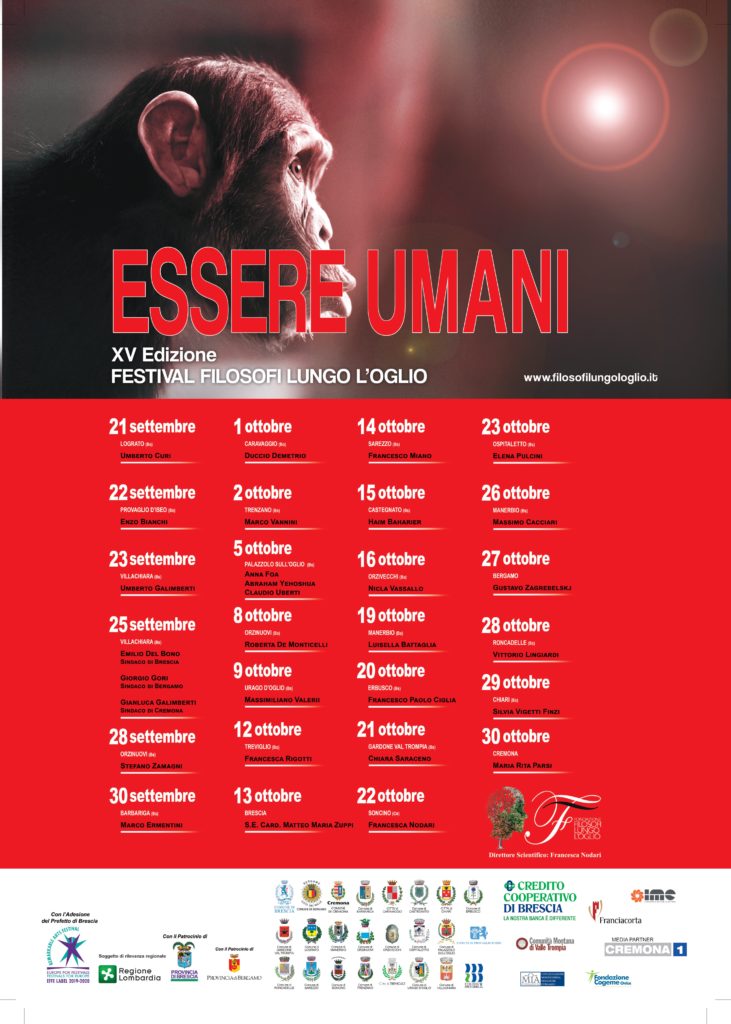 XV edizione il festival del pensiero “Filosofi lungo l’Oglio”, ideato e diretto dalla filosofa levinasiana Francesca Nodari, si svolgerà dal 21 settembre al 30 ottobre 2020 nelle province di Brescia, Bergamo e Cremona. Una appassionante maratona del pensiero con protagonisti alcuni tra i più importanti pensatori e filosofi italiani e internazionali e che, per il quindicesimo anno consecutivo, rinnova il suo forte legame con il pubblico da sempre presenza attenta e partecipe del festival.